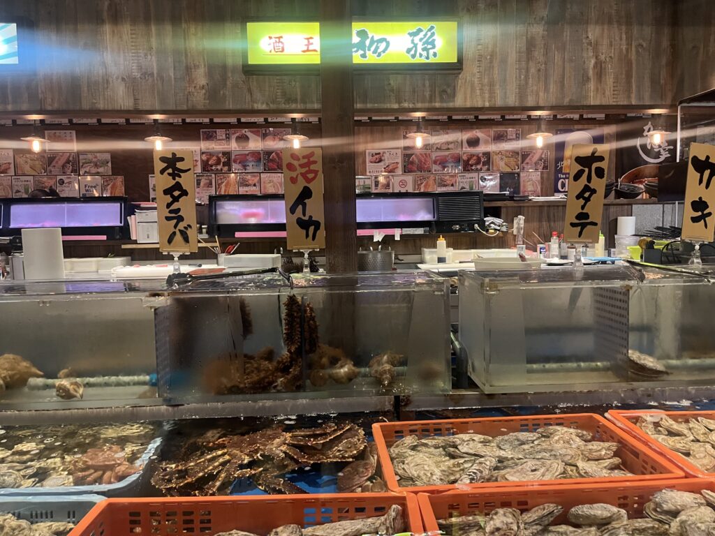 店内には生簀がズラリ!カニやカキ、イカなど新鮮な海鮮たちがたくさんでした!